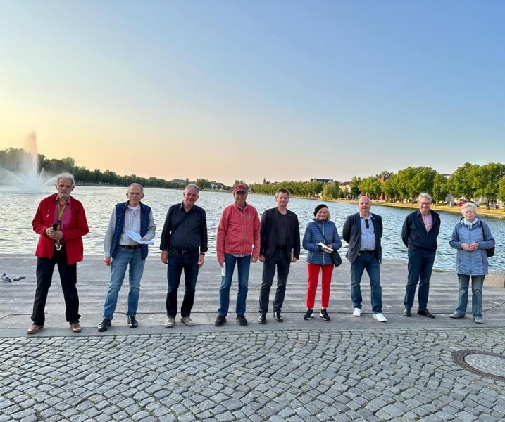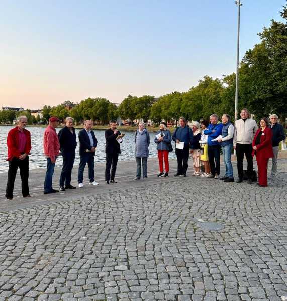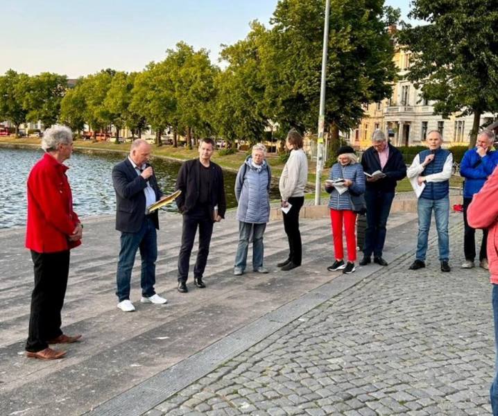 Mit dem Besuch der Wahlparty im Tisch war der Abend noch nicht zu Ende. Am Schweriner Pfaffenteich erinnerten zehn ganz verschiedene Persönlichkeiten aus Medien, Theater, Politik und Wirtschaft an die Bücherverbrennung vor 90 Jahren. Ich verlas dabei Gedichte von Karl Marx.